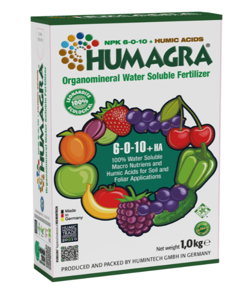 HUMAGRA ” کود حاوی هیومیک اسید، فولویک اسید، نیتروژن، پتاسیم و گوگرد است. وجود هیومیک اسید سبب افزایش قابلیت نگهداری آب در خاک، افزایش ظرفیت تبادل کاتیونی در خاک (CEC)، بهبود جذب عناصر غذایی و … میشود و با کاهش اثرات ناشی از تنشهای محیطی در گیاه و فراهم کردن محیط مناسب برای رشد ریشه، استقرار بهتر گیاه و رشد بهتر آن را به همراه دارد. این ترکیب با داشتن نیتروژن، پتاسیم و گوگرد، عملکرد بالای محصول را فراهم میکند.